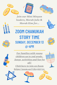 Join Morah Julie and Morah Kim, our Mini Minyan leaders on Zoom, as they lead the young families of TBS including up to 2nd grade in a Story Time for Chanukah – fun, song and activities for all.